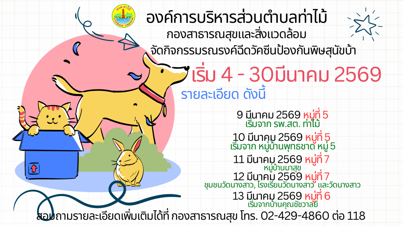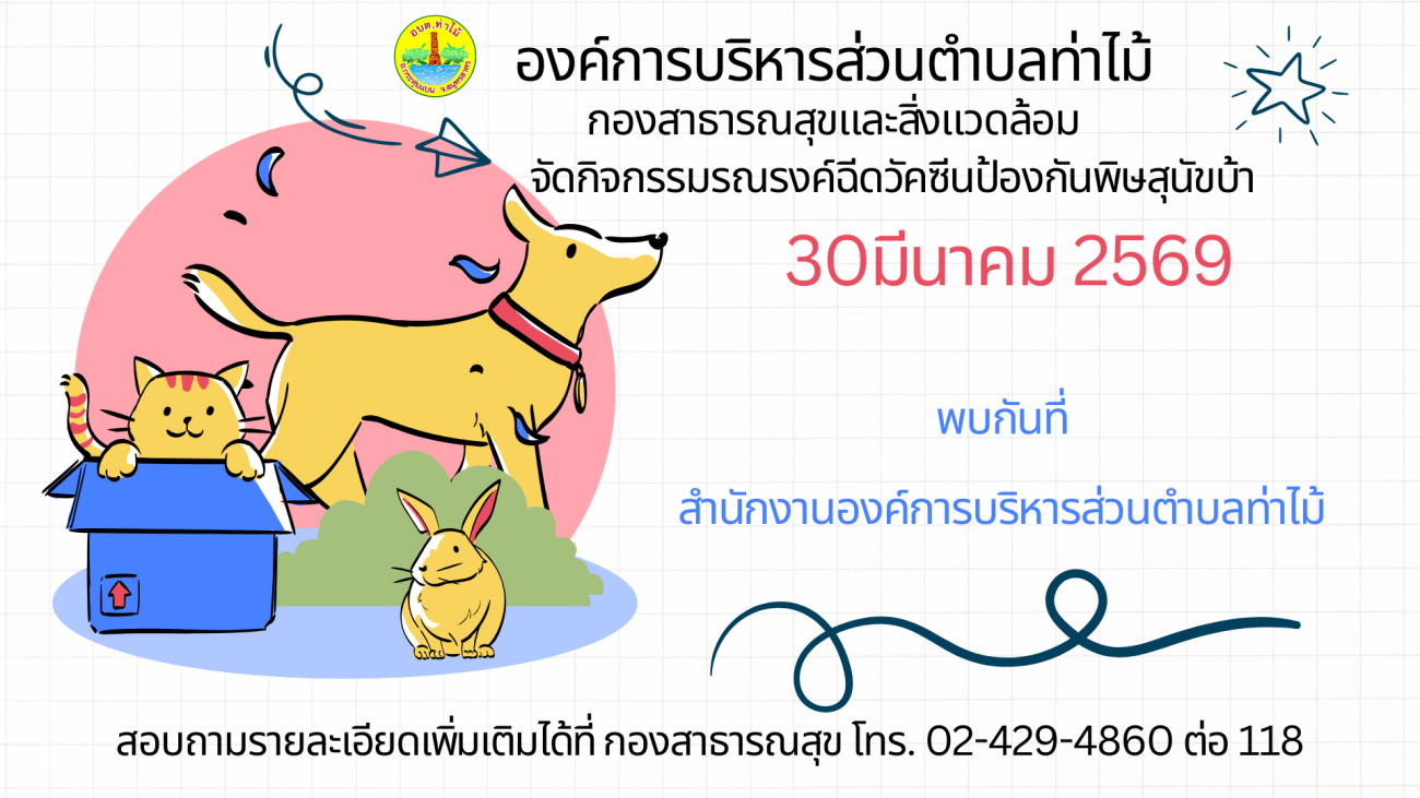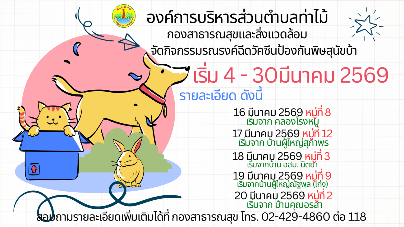 องค์การบริหารส่วนตำบลท่าไม้ ขอเชิญชวนพี่น้องประชาชนในพื้นที่ นำน้องหมาและน้องแมวที่มีอายุตั้งแต่ 3 เดือนขึ้นไป เข้ารับการ "ฉีดวัคซีนป้องกันโรคพิษสุนัขบ้าประจำปี" เพื่อสร้างภูมิคุ้มกันและปกป้องคนที่คุณรักจากโรคร้ายค่ะ!